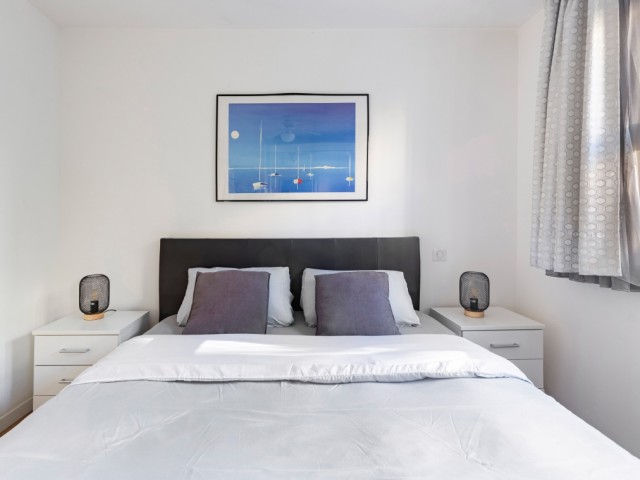 The apartment features a modern and functional layout with an open-plan living area. The windows overlook a quiet courtyard. Ample storage space and a portable air conditioner are included.